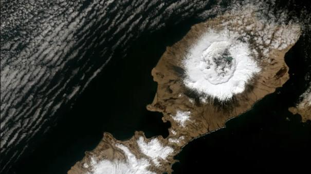 Alaska’s Umnak Island in the Aleutians showing the huge, 10-km wide caldera (upper right) largely created by the 43 BCE Okmok II eruption at the dawn of the Roman Empire.
