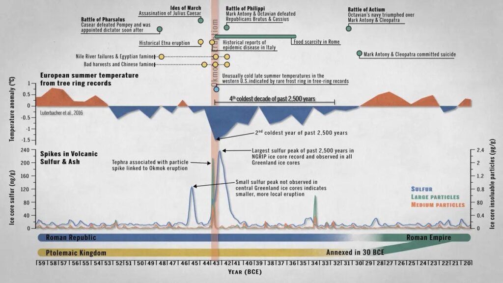 Written sources identify a period of exceptionally cold weather, crop failures, drought, plague and anarchy in the Mediterranean region around the time of Julius Caesar’s death (44 BCE)—impacts that eventually led to the downfall of the Roman Republic and the Ptolemaic Kingdom of Egypt.