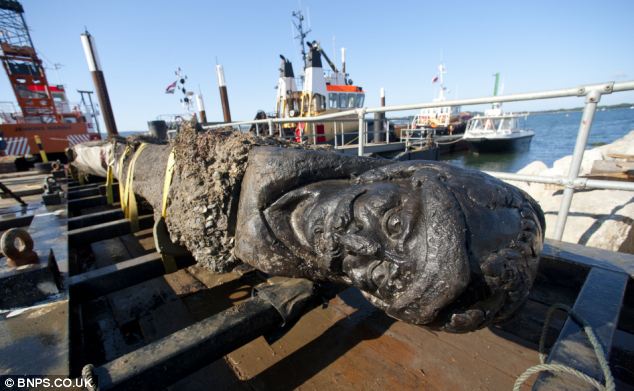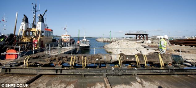 It was then towed four miles into Poole Harbour where today it was hoisted onto the quayside by a crane in front of the excited team of archaeologists.