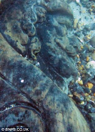 17th-century Dutch merchant ship off southern England have recovered a 30-foot-long wooden carving of a mustachioed warrior