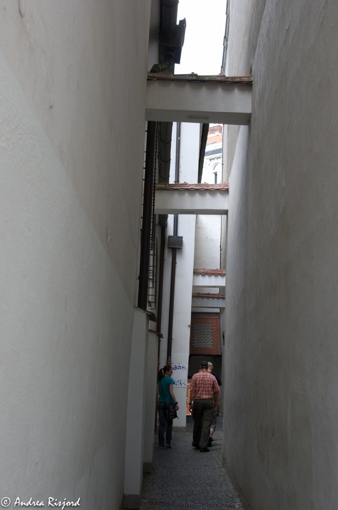 It is reached by walking through abnormally (by today’s standards) narrow alleys with whitewashed walls and small beams holding lanterns high above the street.