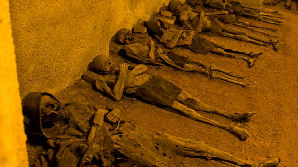 Mummified monks and the accidentally interred, in a 17th-century crypt.
