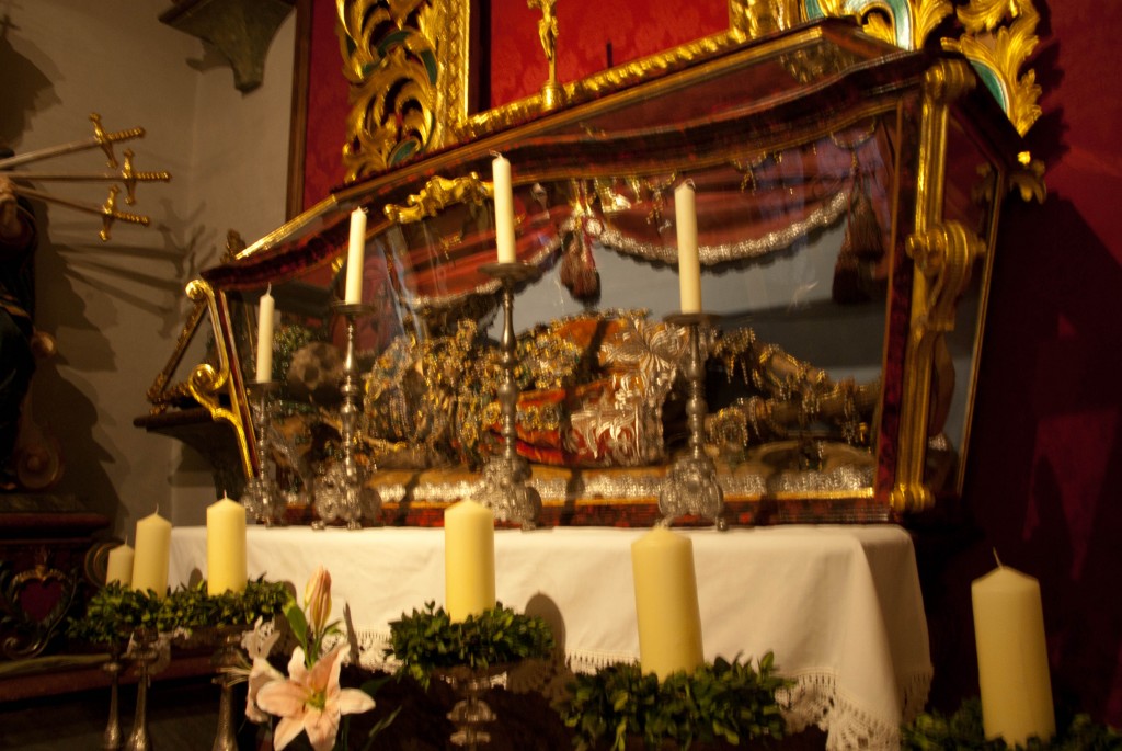 There is also the body of a Saint in the crypt in Brno. this particular Saint is prepared in the “Spanish style.” She is dressed up in clothing that shows the bones. Saints’ bones are very important because they are primary relics of the Siant.