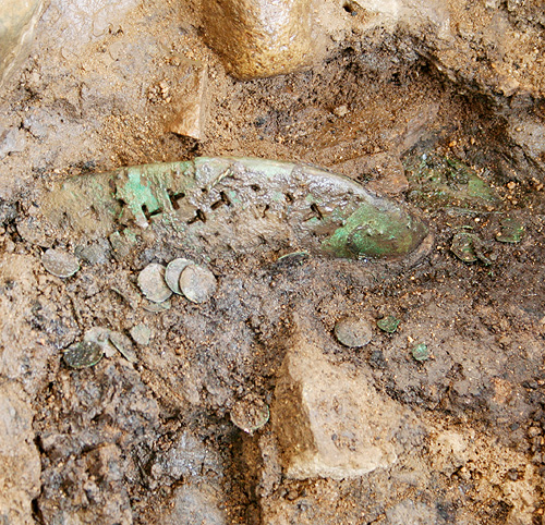 In addition, a silver plate to embellish a belt was found near the legs and several Buddhist gilt bronze ornaments were found near the head.