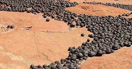 Walkers wandering through the sandy canyons of Utah sometimes come across a strange sight. Where the Navajo Sandstone loses its iconic peach, orange, and red stripes, hundreds of round, iron-coated stones often litter the ground.