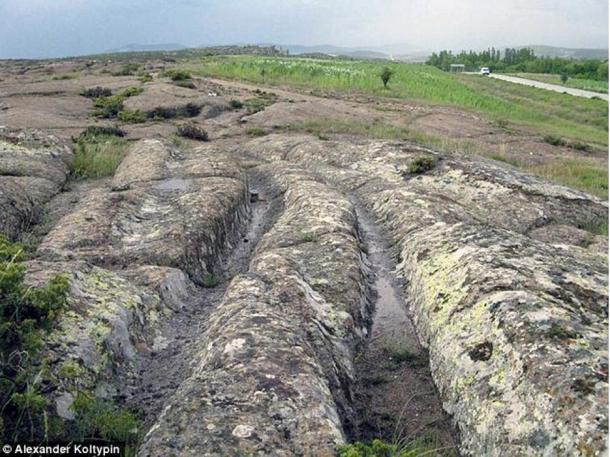 Dr. Koltypin, director of the Natural Science Scientific Research Centre at Moscow’s International Independent Ecological-Political University has just returned from a field trip to the site in Anatolia with three colleagues. He described the markings as ‘petrified tracking ruts in rocky tuffaceous [made from compacted volcanic ash] deposits’.