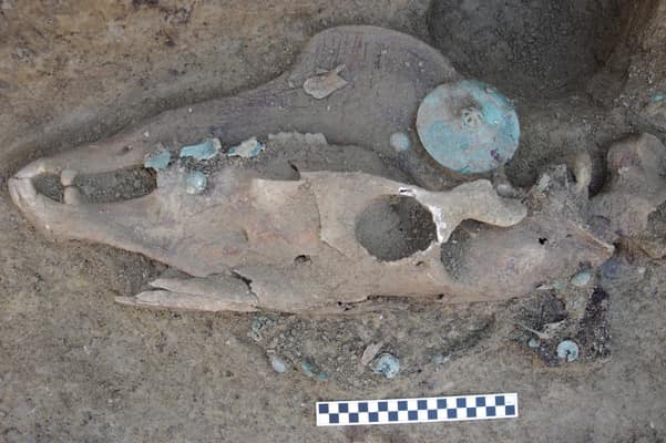 In addition to the walled grave, the archaeologists explored an ordinary earthen grave, where they found a warrior and his horse, with unique bridle ornaments.