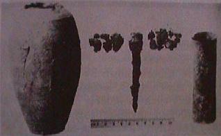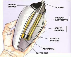 The Object he first found (left), was a 6-inch high pot of bright yellow clay containing a cylinder of sheet-copper 5 inches by 1.5 inches. The edge of the copper cylinder was soldered with a lead-tin alloy comparable to today’s solder. The bottom of the cylinder was capped with a crimped-in copper disc and sealed with bitumen or asphalt. Another insulating layer of Asphalt sealed the top and also held in place an iron rod suspended into the centre of the copper cylinder.
