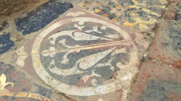 The vividly-colored tiles, which have not been seen in 500 years, display the coats of arms of powerful Norman monarchs and barons.