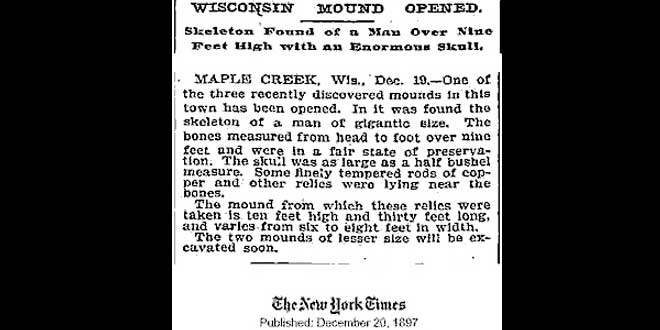 On 20 December 1897, the Times followed up with a report on three large burial mounds that had been discovered in Maple Creek, Wisconsin. One had recently been opened.