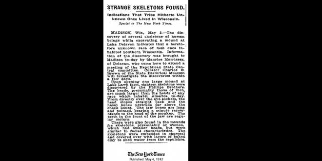 The dig site at Lake Delavan was overseen by Beloit College and it included more than 200 effigy mounds that proved to be classic examples of 8th century Woodland Culture. But the enormous size of the skeletons and elongated skulls found in May 1912 did not fit very neatly into anyone’s concept of a textbook standard.
