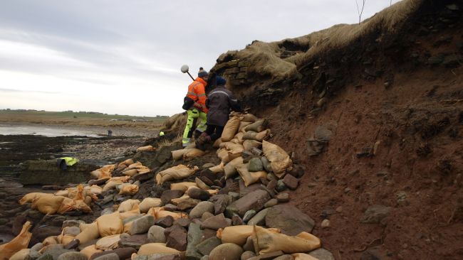 To order to protect the damage to the former Newark Bay cemetery on Orkney’s largest island, volunteers are now placing sandbags and clay around. The site dates from the middle of the sixth century when ancient Pictish people inhabited the Orkney Islands.