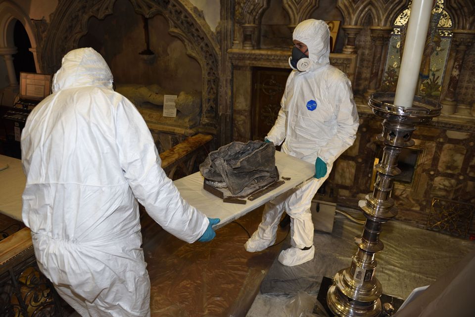 Apart from one bone fragment and a single tooth sent for radiocarbon to Queen’s University Belfast, they stayed in the church during the work, with the archaeologists and scientists sleeping in the church to guard them.