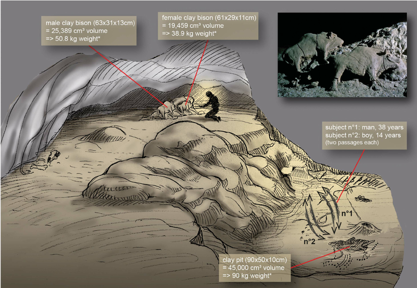 The remote location of the clay bison – beneath a low ceiling at the very end of the upper gallery, roughly 650 meters from the entrance, is consistent with their involvement in some type of ritualistic or shamanistic process.