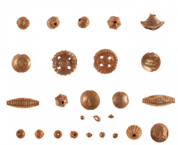 The deposit contained two parts of copper talents, a mass of slag and jewellery: a gold ring, a gold bracelet, 26 gold beads (disc-shaped, round and shaped like a papyrus), one bead of silver, 5 of bronze and the band of a bronze ring.