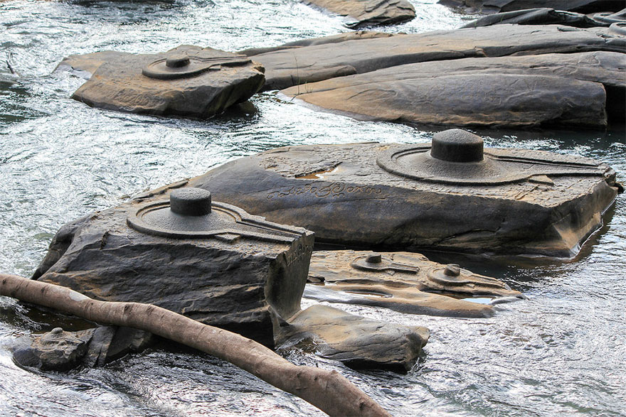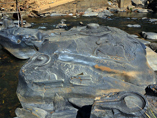 In short, dry weather has led to a reduction in the level of the Shalmala River in Karnataka, India, revealing numerous carvings (known as Shiva Lingas) in the rock bed of female and male sexual symbols, as well as of Nandi, i.e., the Hindu God Shiva’s bull mount.
