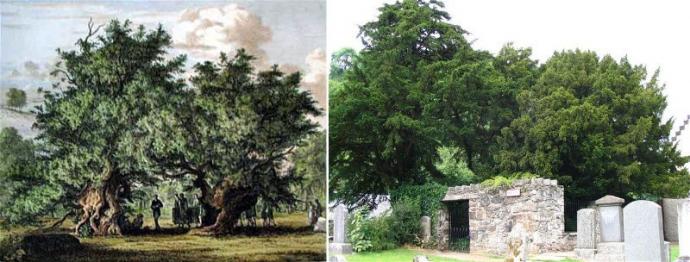 The Fortingall Yew then and now: partying with Victorian dandies in 1822 on the left, and switching gender at present time on the right.