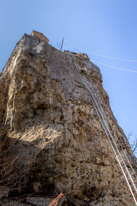 Perched on the top is a church and three hermit cells, accessible only by climbing a precarious steel ladder. The rock was used by Stylites from at least the 9th century up until the Ottoman invasion in the 15th century.