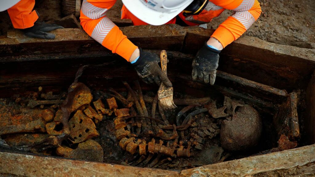 The major dig show archeologists recently released photos clearing thick clay from coffins and brushing the dirt from remains. They are part of an archeological team on the 150-mile HS2 route that is currently delving into 10,000 years of British history.