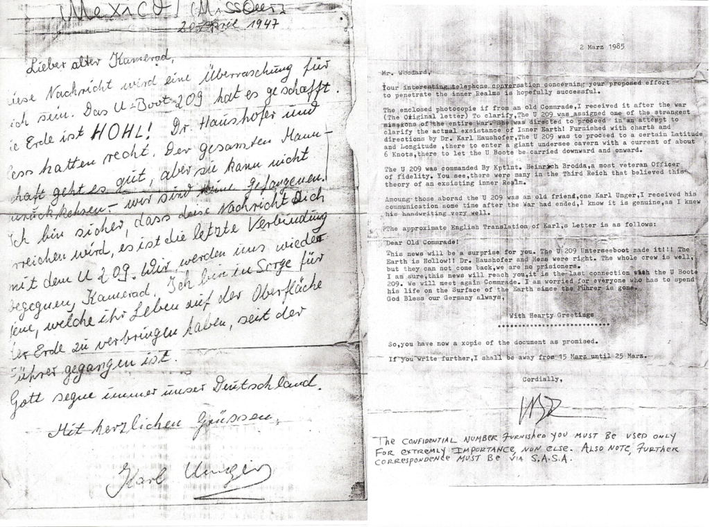 Mr. Watson claims it is a copy of a letter written on 2 March 1985 in the German language from a German submarine crewman who was on board. In it is given certain coordinates for their mission, which apparently was to travel to the center of the earth. Their submarine was called U-209 under Captain Heinrich Brodda. The image below is a copy of the original hand-written letter from Karl Unger, crew member of the German U-209, as well as an English translation (click to enlarge).