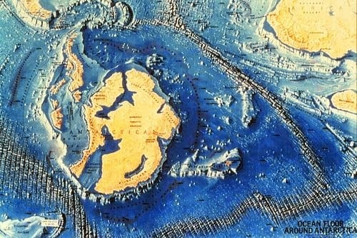 The following map clearly shows the continent of Antarctica without its cover of ice:
