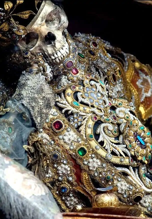 They call them the Catacomb Saints – ancient Roman corpses that were exhumed from the catacombs of Rome, given fictitious names and sent abroad as relics of saints from the 16th century to the 19th century. They were decorated with extreme lavishness, as you can see below.