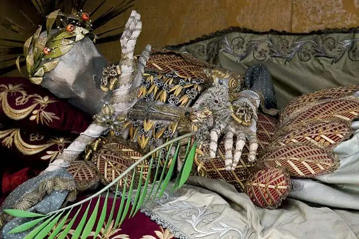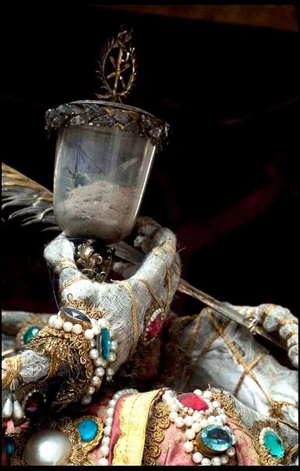 ‘After they were found in the Roman catacombs the Vatican authorities would sign certificates identifying them as martyrs then they put the bones in boxes and sent them northwards. The skeletons would then be dressed and decorated in jewels, gold and silver, mostly by nuns.