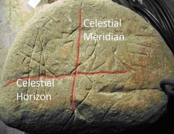 The stone is divided into four quadrants by two intersecting lines. I stress the importance of the two lines. The point of origin is in the lower part of the stone, as they wanted to reproduce the celestial sphere as follows: the vertical line is the Celestial Meridian, while the horizontal line is the Celestial Horizon.