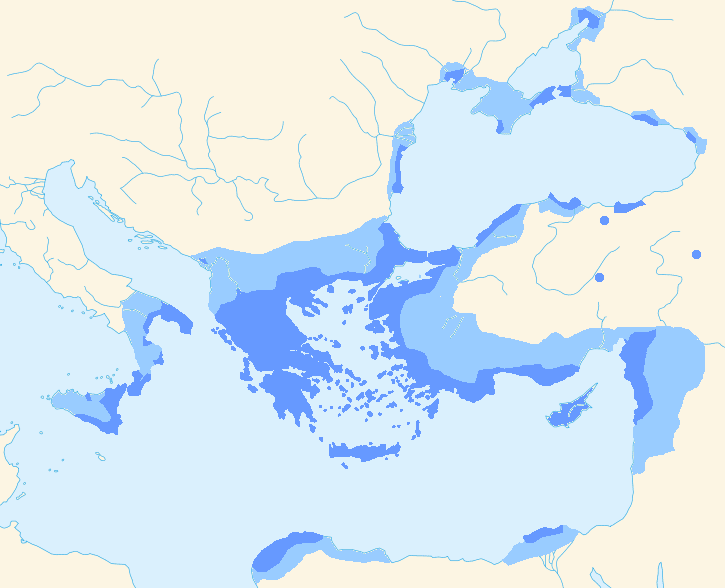 Greek-speaking areas during the Hellenistic period (323 to 31 BC) Dark blue: areas where Greek speakers probably were a majority Light blue: areas that were Hellenized. Wikipedia.