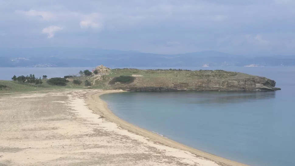The ruins are located on the coast of the middle of the three prominent peninsulas of Chalkidiki (also called Chalcidice), about 40 miles (64 kilometres) southeast of the city of Thessaloniki on the northwest coast of the Aegean Sea.