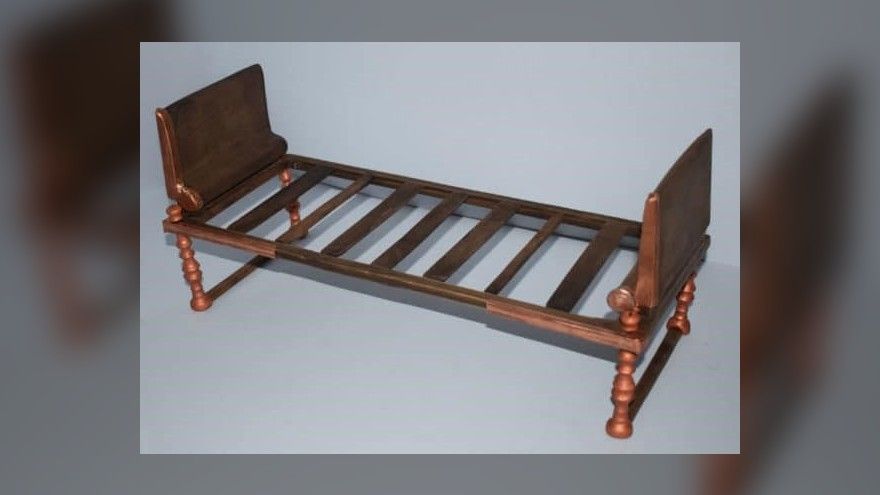 Depictions of mermaids decorate the posts of the bed. The bed also displays an image of a bird holding a snake in its mouth, a symbol of the ancient Greek god Apollo.