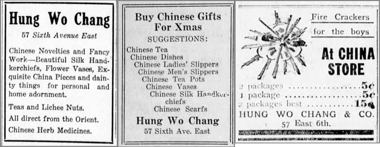 In 1914, Wing Kee opened Hung Wo Chang & Co gift shop on Sixth Avenue, marketing Chinese products to non-Chinese consumers. Marie, Wing Kee’s wife, was listed as the proprietor of the businesses in newspapers and on official city directories in the 1920s.