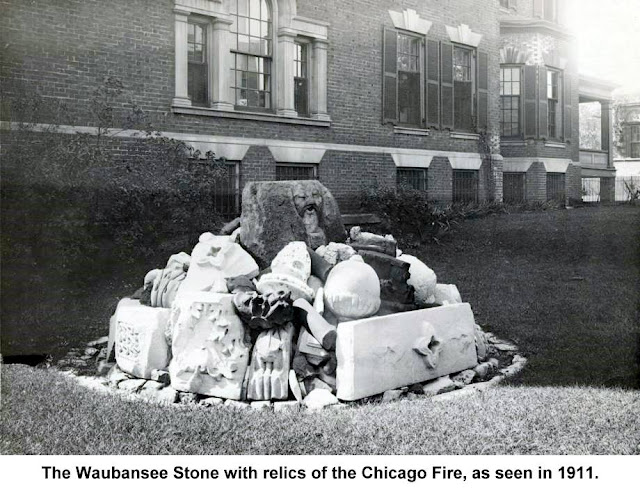 “The second school of historians and antiquarians is convinced that the so-called Waubansee Stone dates back hundreds and perhaps even thousands of years before even Father Marquette first visited the site of Chicago in 1673. They see in the tall boulder, with its deeply top, a sacrificial altar on which perhaps the mound builders of prehistoric America offered even human sacrifices, and they are ready to believe that the face carved on one side of the stone is a representation of an ancient idol—one of the far off gods to whom that mythical people poured libations and offered the sacrificial blood of animals. However that may be, there is no question of doubt that in the early days of Fort Dearborn, as far back as we have any record, that identical stone, practically the same as it is today, lay near the stockade of old Fort Dearborn.”