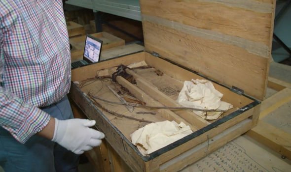 Inside the box, archaeologists found an amazing piece of history. The narrator explained: “These delicate wooden pieces are ancient boat parts and belong to one of the model boats that Howard Carter found in Tutankhamun’s tomb.