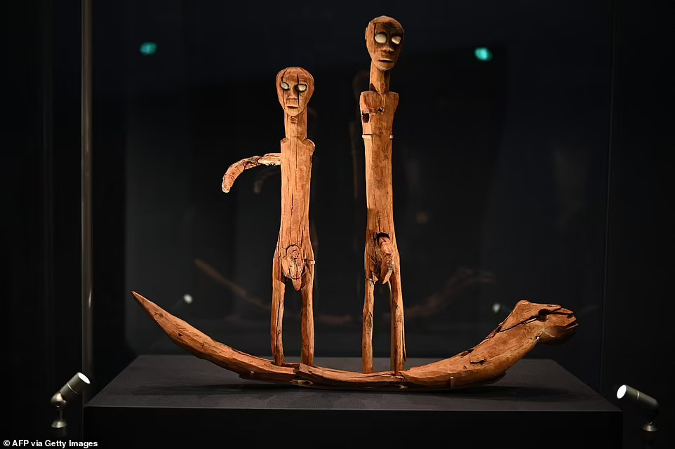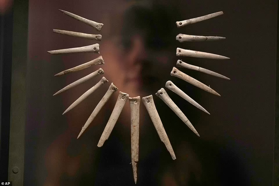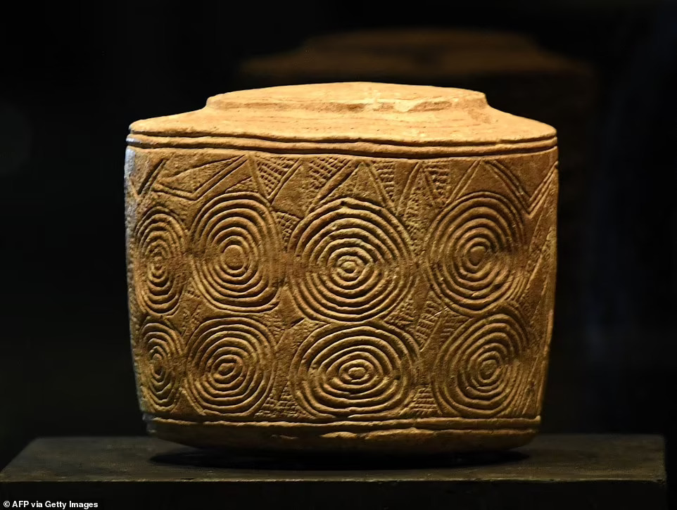 The chalk drum, which bears intricate circular etchings, was found alongside the ancient burial of three children near the village of Burton Agnes in East Yorkshire. Other artefacts on display include two gold hats and an ancient wooden monument called ‘Seahenge’ which dates back 4,000 years.