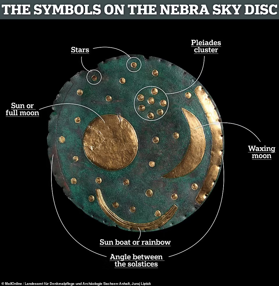 Stunning photos taken today show the 12-inch sky disc in all its glory. It is inlaid with gold symbols that are believed to represent the moon, sun, solstices and stars, and was unearthed by looters in Germany in 1999.