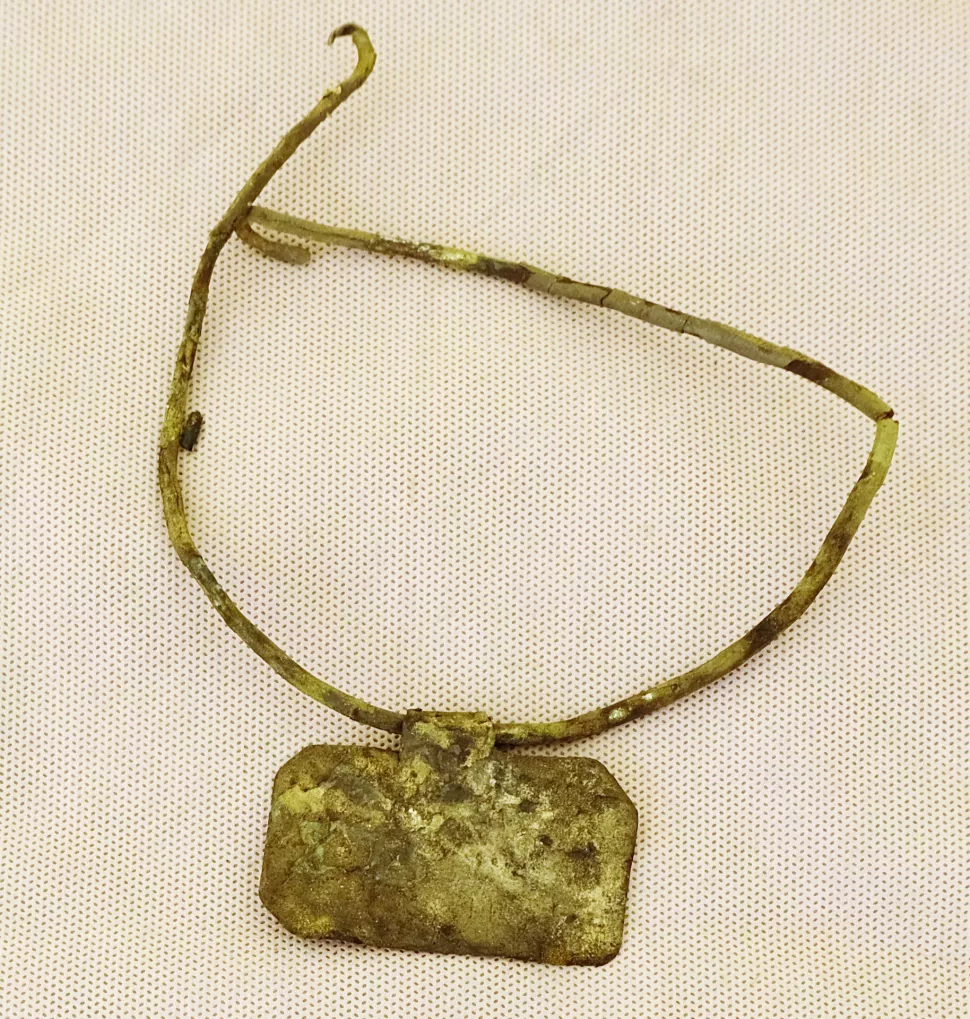 The archaeologists discovered a copper necklace with the inscription “Nikostratos” next to a mummy.