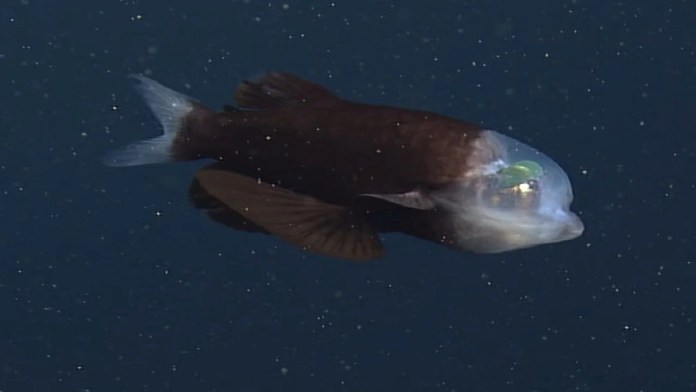 Alien-like fish with a translucent head that exposes its green eyes is spotted near California