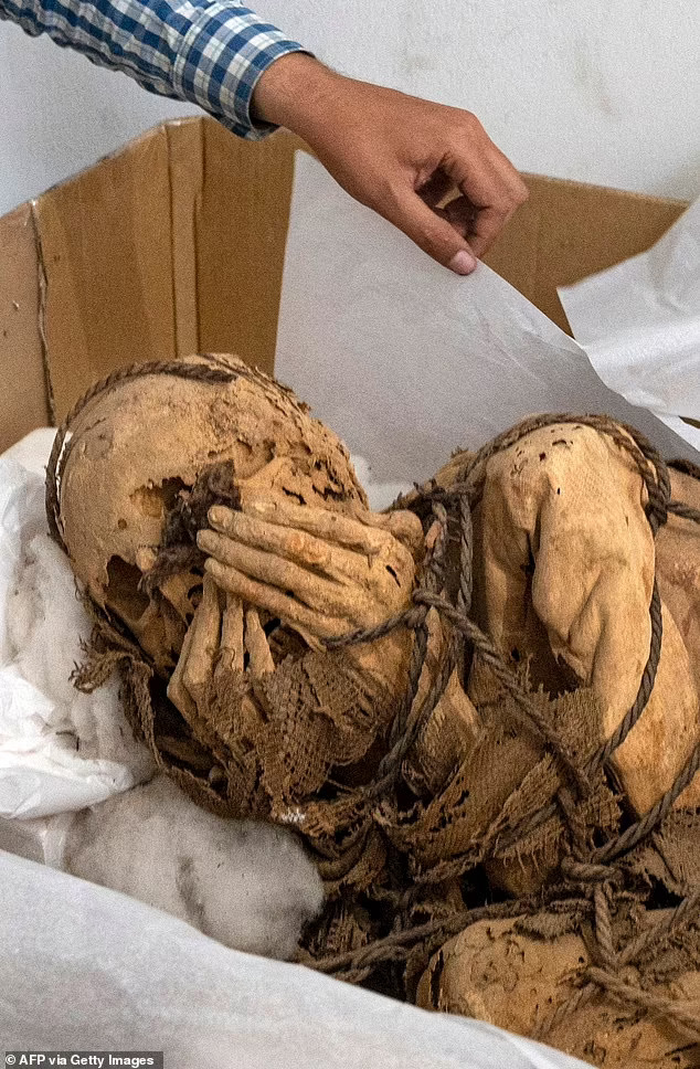 ‘The main characteristic of the mummy is that the whole body was tied up by ropes and with the hands covering the face,’ Professor Van Dalen Luna said.