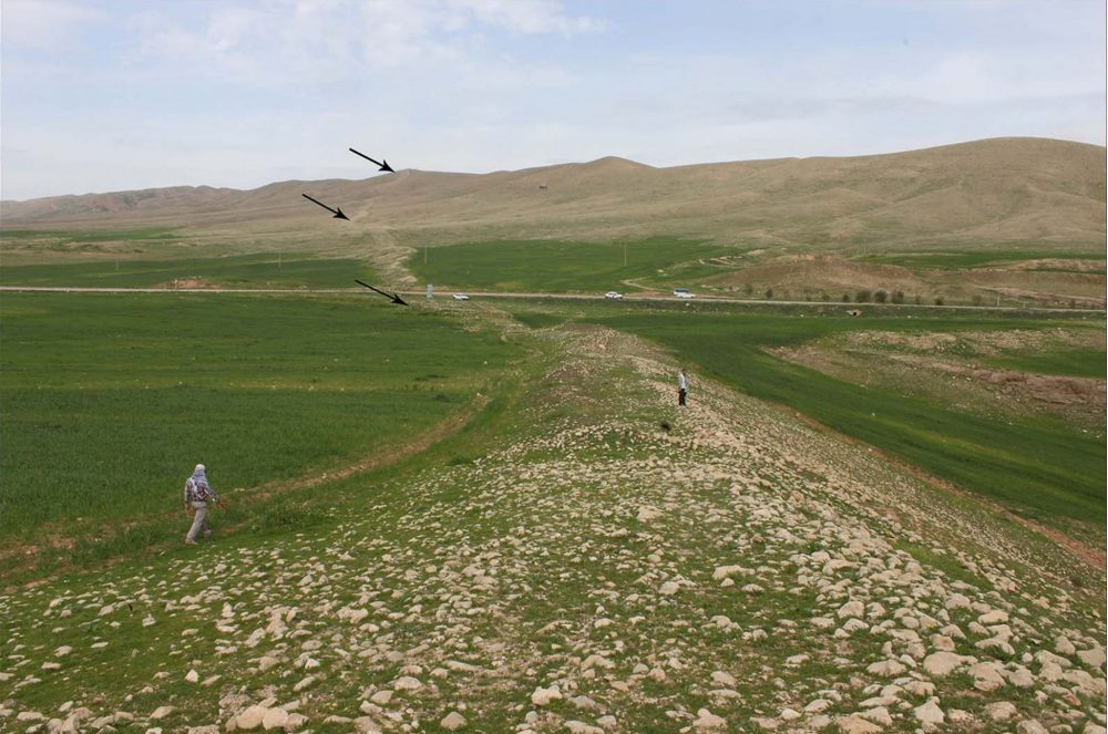 The Gawri Wall in the western mountains of Sar Pol-e Zahab; arrows indicate the wall’s line.