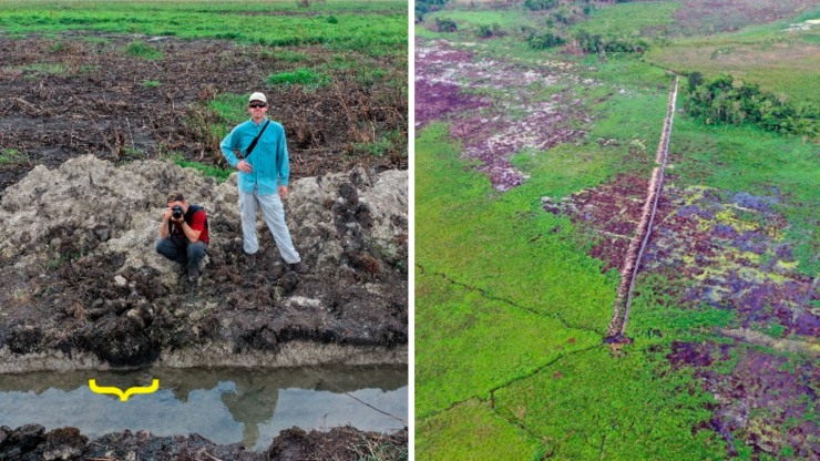 The lidar — along with boots-on-the-ground surveying (left) and aerial photography (right) — showed evidence of expansive irrigation channels across the region. The depression with dark soil at the left shows the remains of an ancient channel.
