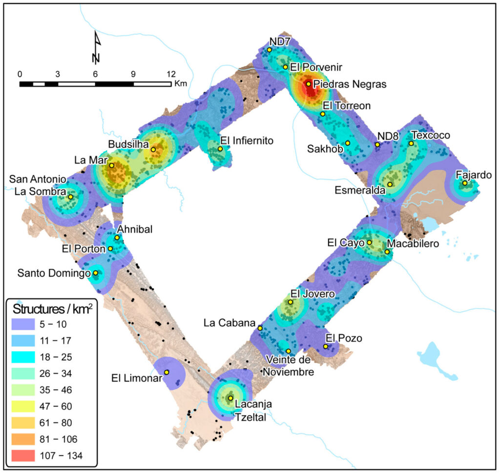 Lidar scans of the research area revealed the relative density of structures in Piedras Negras, La Mar and Lacanjá Tzeltal, providing hints at these cities’ respective populations and food needs.