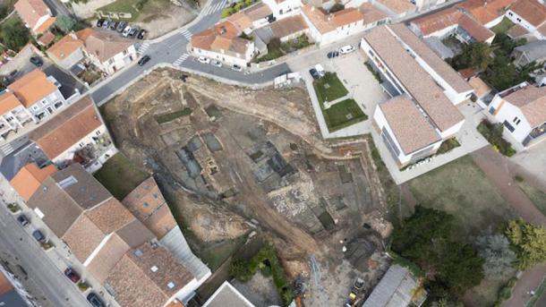 Aerial view of the medieval port excavation area in the village at the foot of France’s Chateau Talmont-Saint-Hilaire.