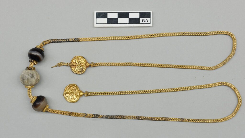 A solid-gold chain necklace, more than 2 feet long with pendants on either end, was also found near his neck.