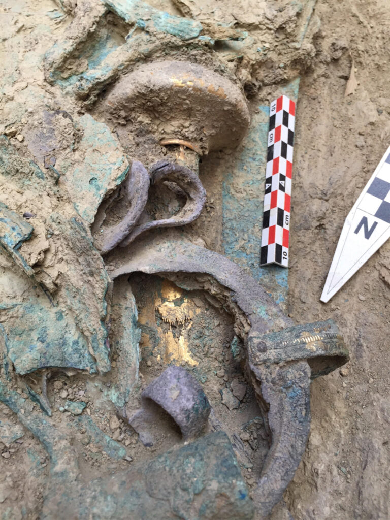 Other weapons, made of bronze, including a slashing sword and spearhead, were found at his legs and feet, and the remnants of a bronze suit of armour were found on top.