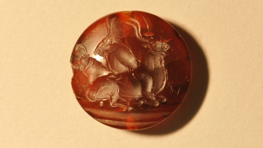 Dozens of seal stones, which were decorated with detailed etchings in the Minoan style, were found to the left and right of the warrior’s skeleton. About the size of a quarter, the seal stones depicted goddesses, lions and bulls, and men jumping over a bull’s horns, a common sport in the Minoan civilization.