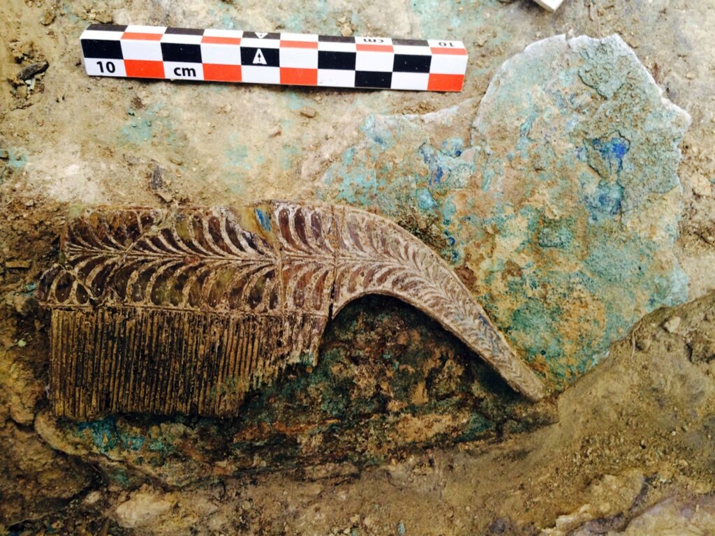Six fine-toothed ivory combs, mostly intact and about 6 inches long, were uncovered in the grave. They were intricately decorated and accompanied by a bronze mirror with an ivory handle. Stocker says it’s significant that the warrior was buried alone, and that jewels, combs, and a mirror accompanied him.