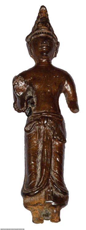 ‘Bronze monks’ bells and gold ceremonial rings are studded with rubies and adorned with four-pronged golden vajra sceptres, the Hindu symbol for the thunderbolt, the deity’s weapon of choice. Exquisite gold sword handles would have graced the sides of royal courtesans, while bronze mirrors and hundreds of gold rings, many stamped with enigmatic letters, figures and symbols, earrings and gold necklace beads resurrect the splendour of a merchant aristocracy going about its daily dealings, stamping shipping manifests, in the palace complex.’