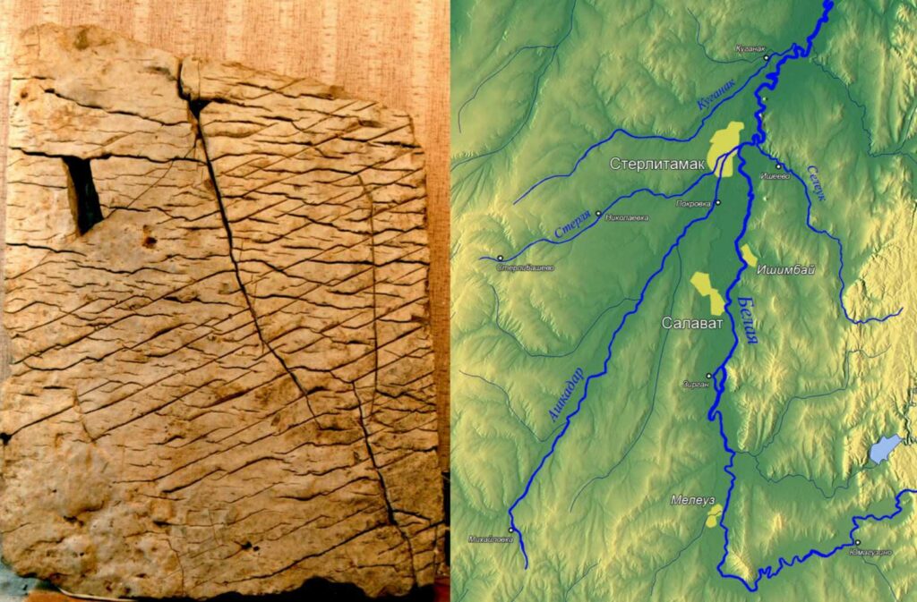 Although all the efforts to decipher the inscriptions were fruitless, it was found out that the literature had hieroglyphic-syllabic characters. Chuvyrov, however, states he has deciphered one sign on the map: it signifies the latitude of today’s city of Ufa. The longer the stab was studied, the more mysteries appeared. On the map, a giant irrigation system could be seen: in addition to the rivers, there are two 500-metre-wide channel systems, 12 dams, 300-500 metres wide, approximately 10 km long and 3 km deep each.