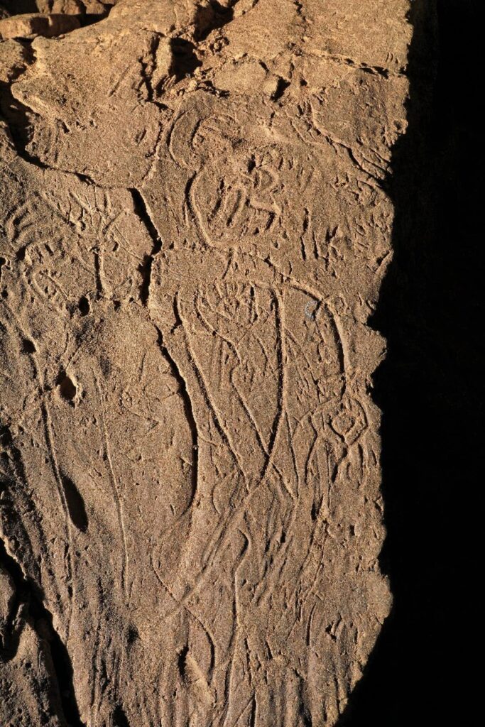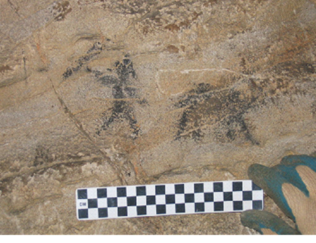 On the walls around them, they began to see lines and figures traced into remnant mud banks laid down long ago when the stream flowed at this higher level. No modern or historic graffiti marred the surfaces. They saw images of animals, people and transformational characters blending human characteristics with those of birds, and those of snakes with mammals.